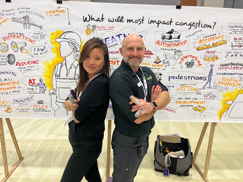 One creative stop was the interactive Wisdom Wall on display in the Exhibit Hall. Attendees wrote or called out answers to transportation-related questions—such as, “What will most improve safety?”—and artists Mary Jo Neil, Ann Owl, and Brian Tarallo then depicted the responses.