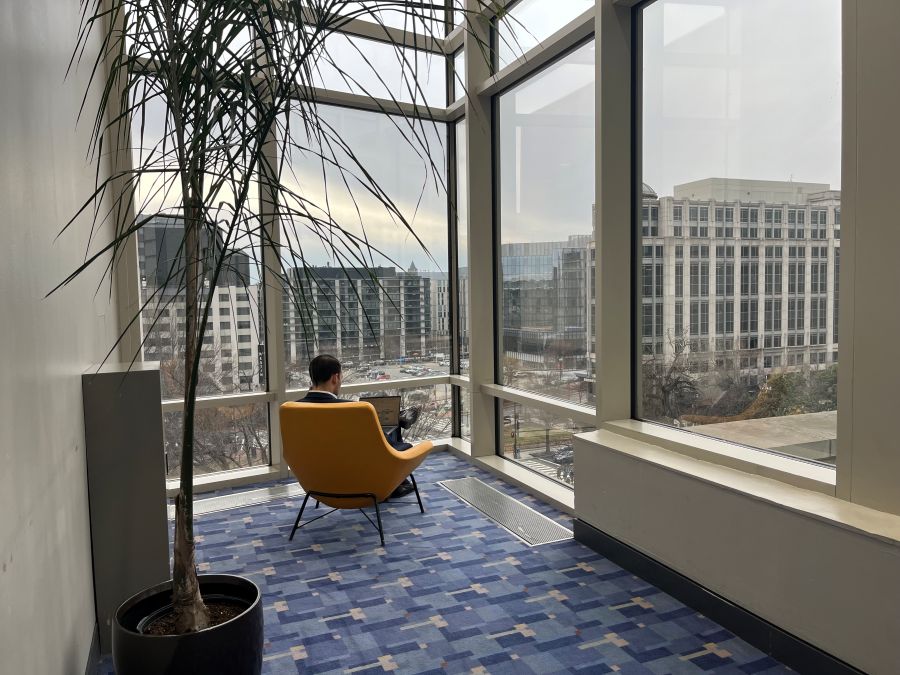 - One attendee found solitude with his laptop in a makeshift corner office with a view. (Mary Lord, TRB Staff)