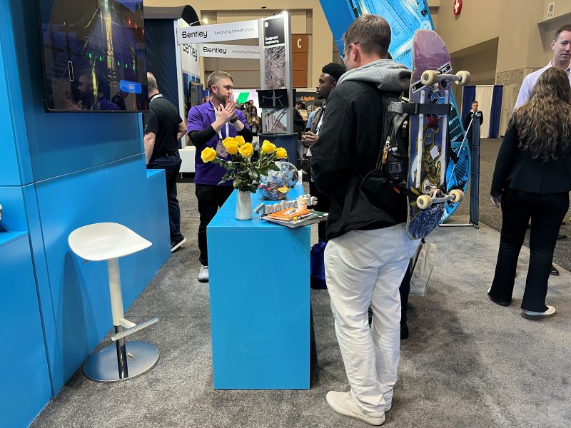 - FHWA exhibitor Phea Padgett (left) joins fellow exhibitor Kristin Kersavage of VHB and attendee Bryan Katz at a street scene on an exhibit monitor.