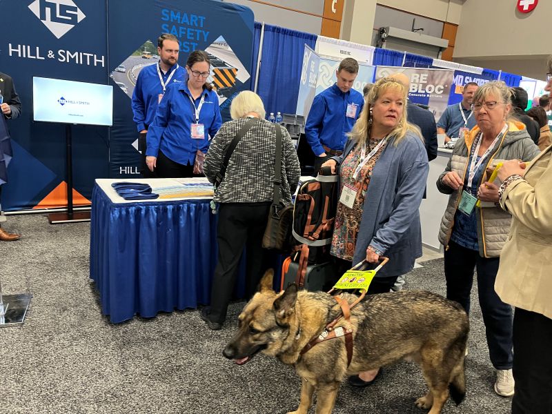 - With assistance from her service dog Fred, attendee Suzette May navigates through the crowded Exhibit Hall. (Mary Lord, TRB Staff)